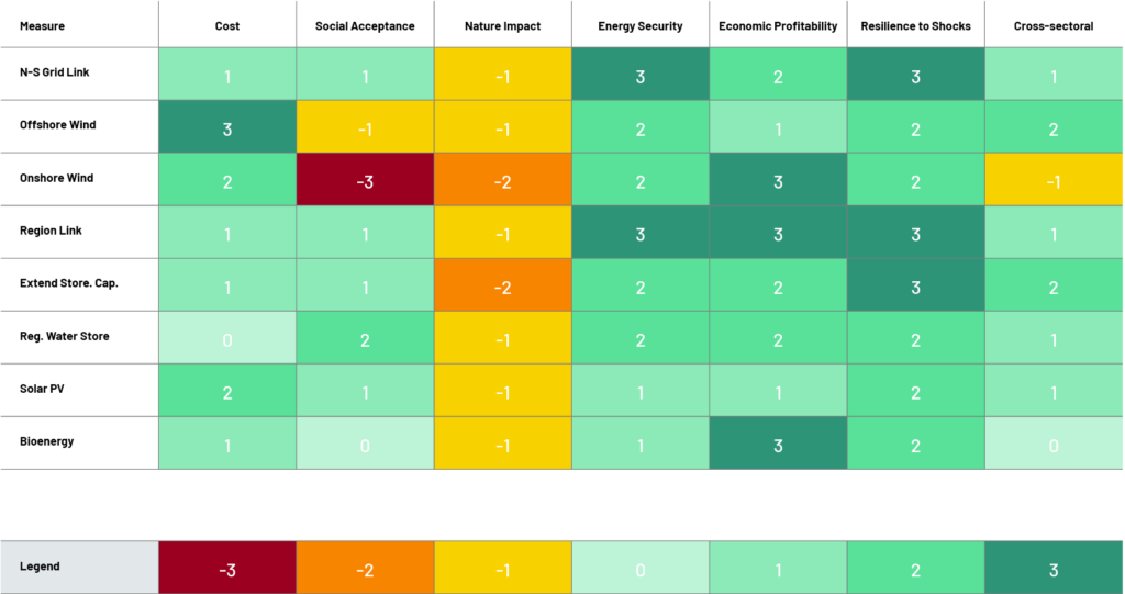 The pilot assessed the measures in relation to these seven dimensions through a subjective scoring system, based on expert judgment and existing evidence. When creating the score matrix, the pilot aimed to gain a more holistic perspective of the energy sector, as well as providing a clear visualisation of how each energy measure contributes to cross-sectoral aspects.