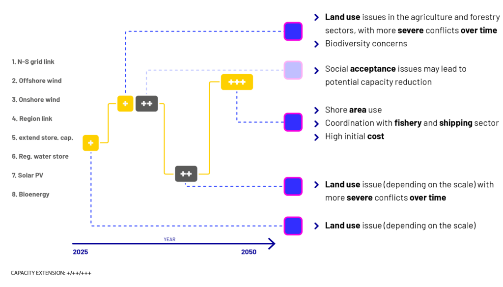 The rows represent the energy-specific measures. The time-axis indicates the time scale of the pathway. The signs of ‘+’, ‘++’, ’+++’, and ’++++’ indicate the capacity extension of each measure in the pathway over time. Red ‘+’ symbols denote changes in capacity expansion under the scenario compared to the baseline.
