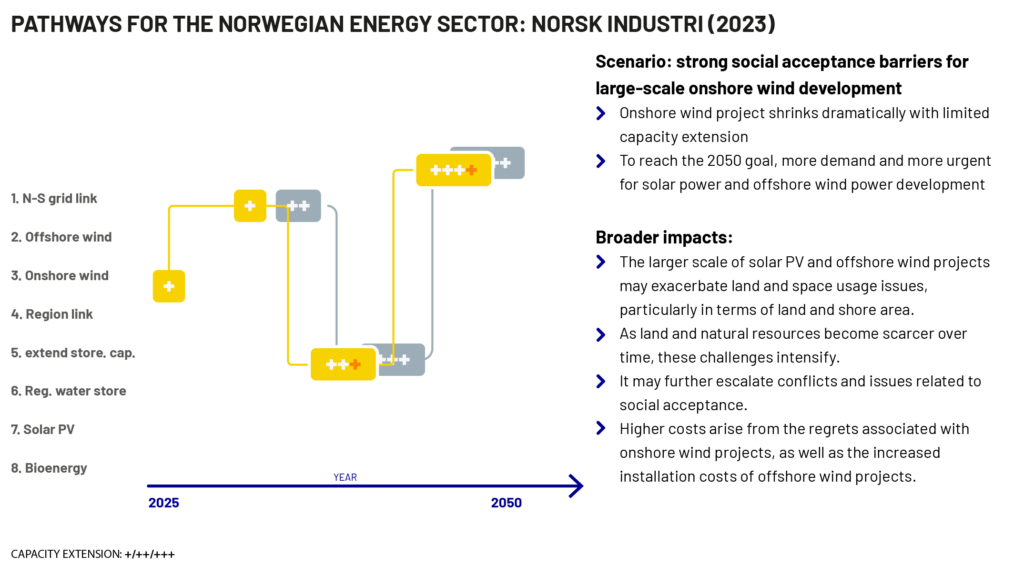 As shown in Gottardo et al. (2025), numerous academic papers have already recognized the challenges related to social acceptance associated with renewable energy development, particularly for onshore wind farms in Norway. Therefore, the pilot decided to increase the focus on social acceptance and evaluated how each pathway would evolve in the case of a “social acceptance barrier”, where, for example, strong social resistance would appear due to large-scale onshore wind development.